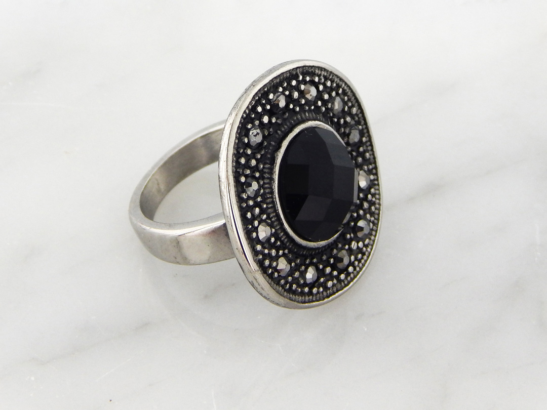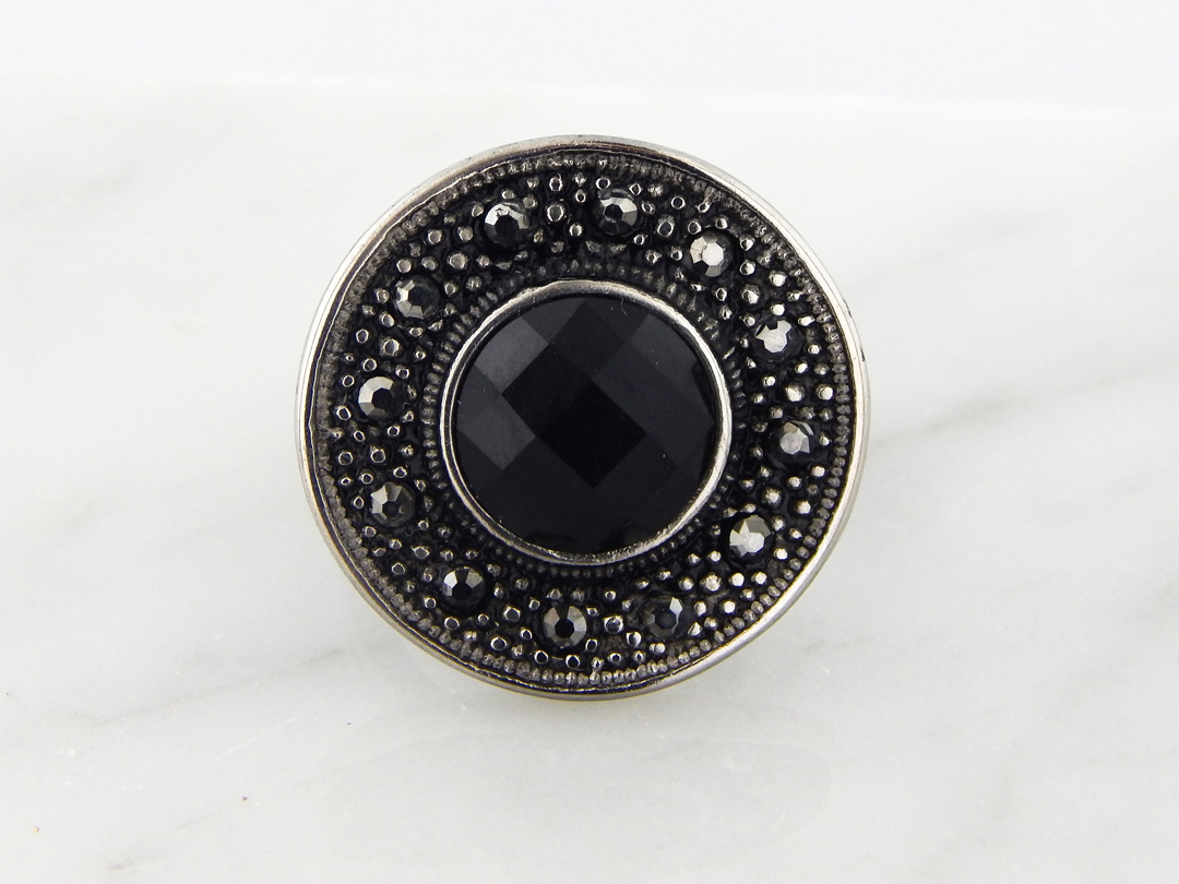 Anillo de Acero trabajado y Piedra Negra Redonda Facetada simil Marquesita.