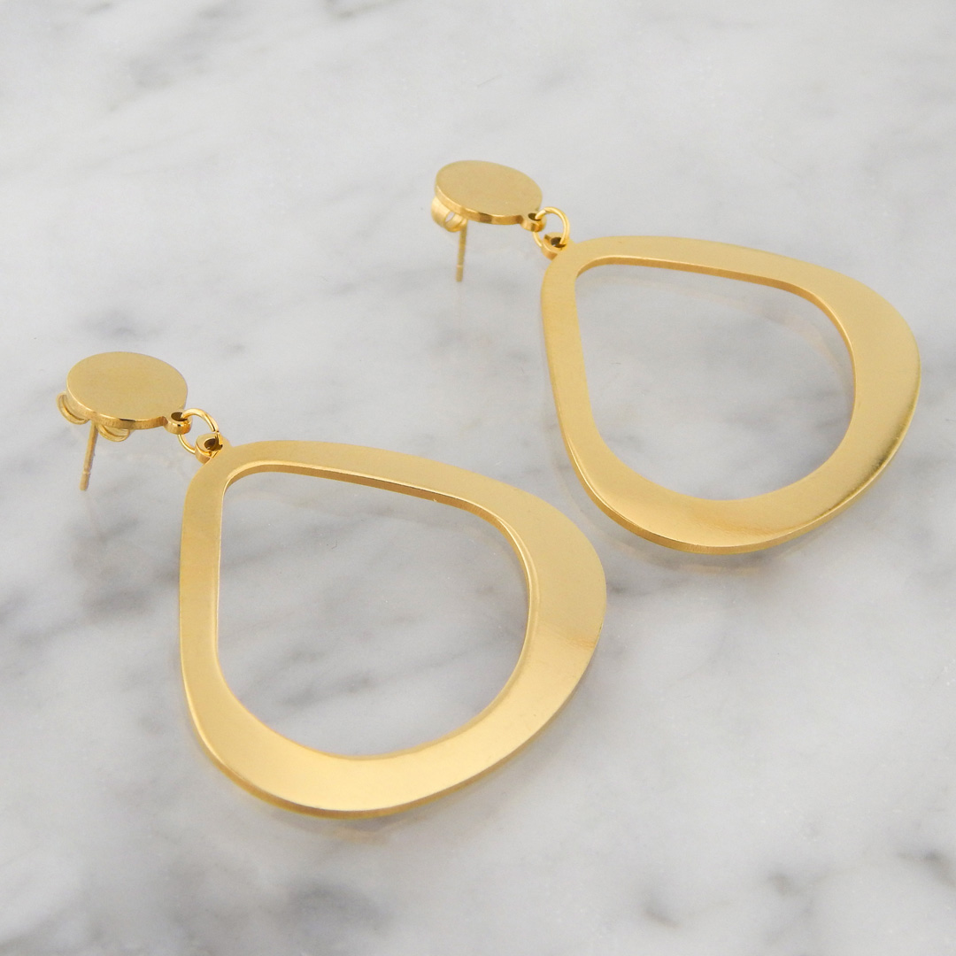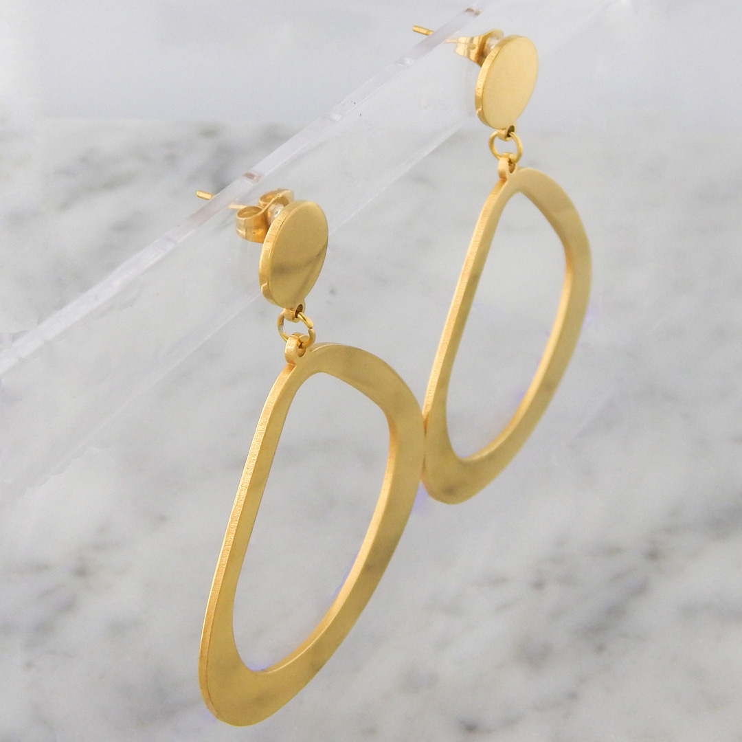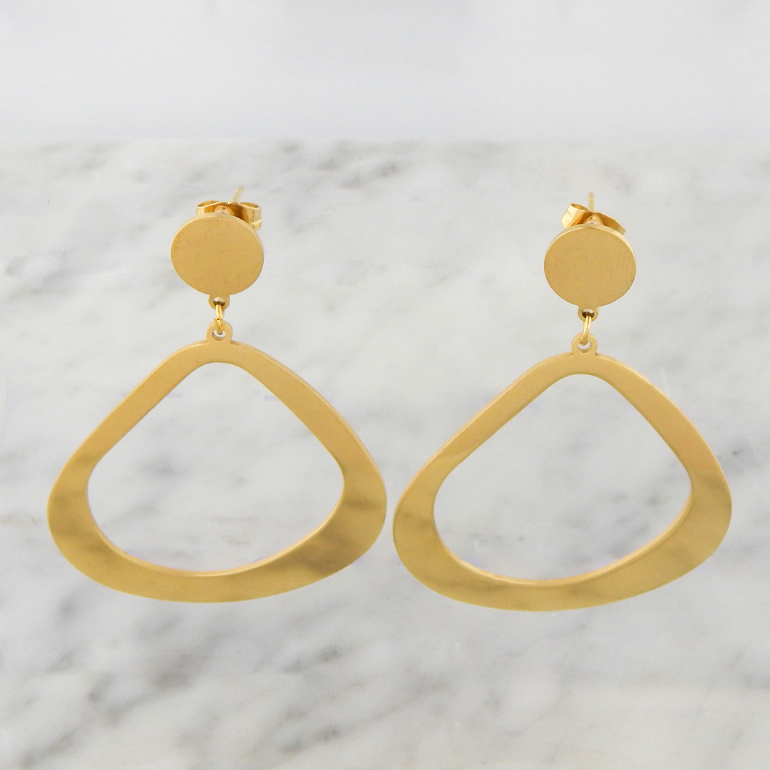 Aros de Acero Dorado con forma de Triangulo Redondeado de 4 cm de Base x 3.5 cm de alto aproximadamente, colgante de circulo de 10 mm de diámetro.