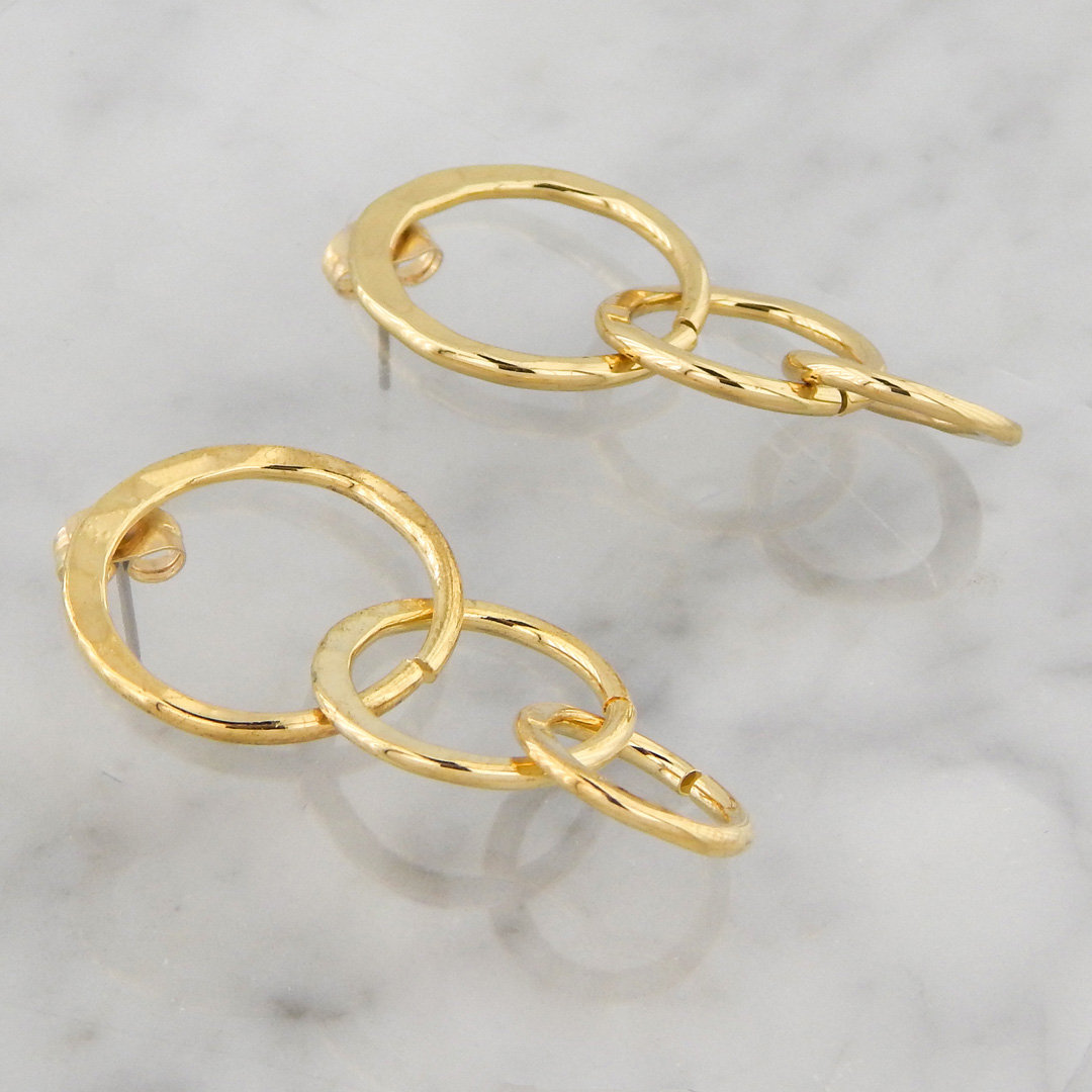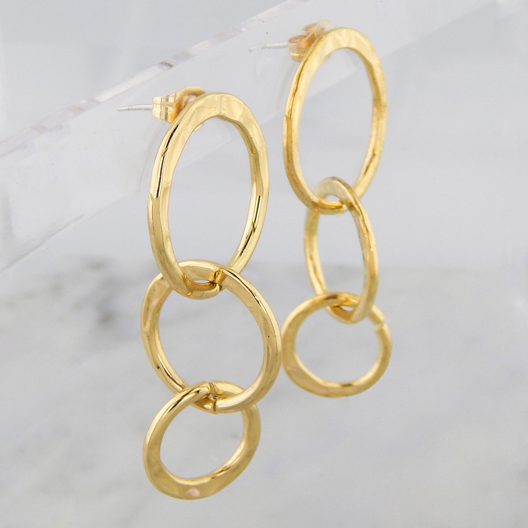 Aros de Acero Dorado con forma de Circulos Enlazados de 13, 16 y 20 mm de diámetro aproximadamente, dando un largo total al aro de 4.2 cm.