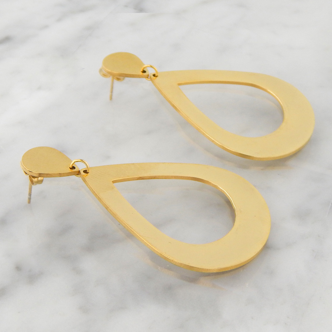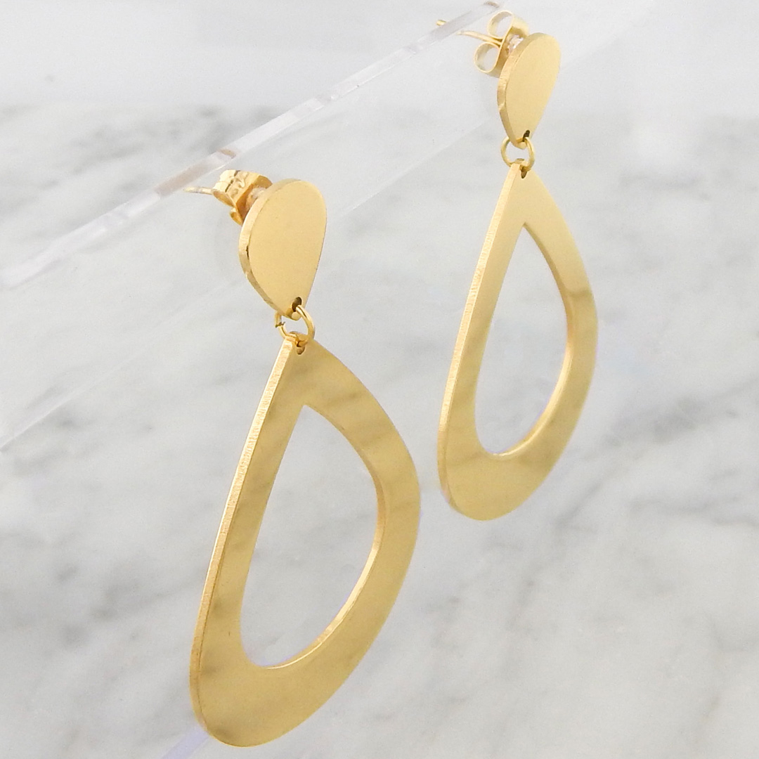 Aros de Acero Dorado con forma de Triangulo Redondeado de 3.2 cm de Base x 4 cm de alto aproximadamente, colgante de Gota Invertida de 10 x 12 mm.