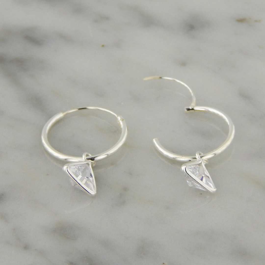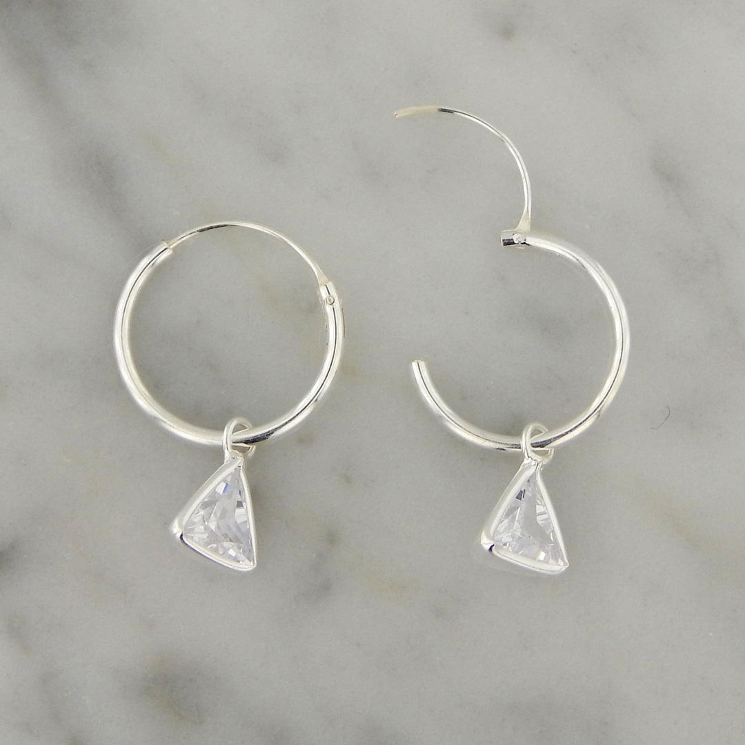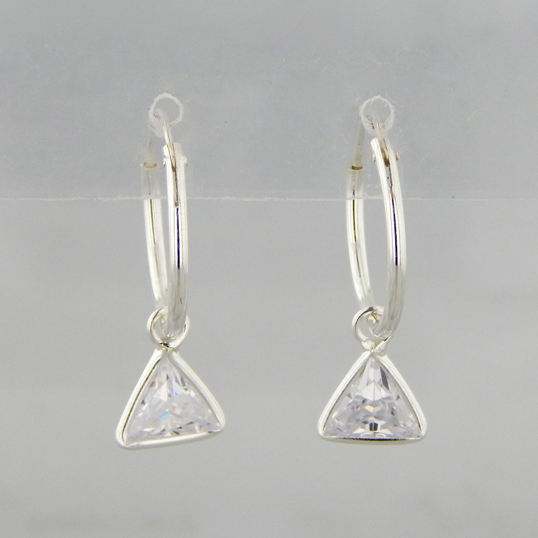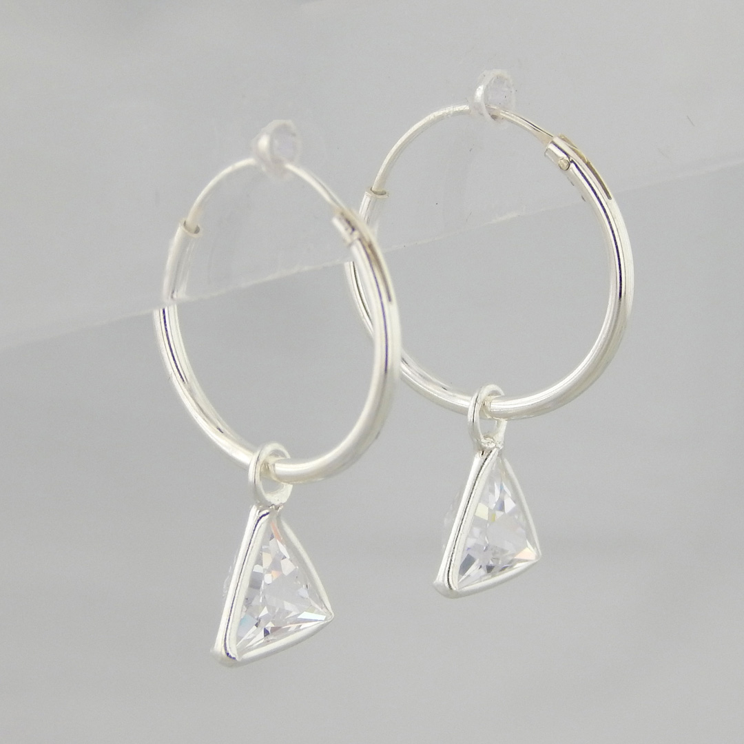 Aros de Plata tipo Argolla de 13 mm de Diámetro con Dije Colgante de Cubic Triangular de 6 mm de Lado.