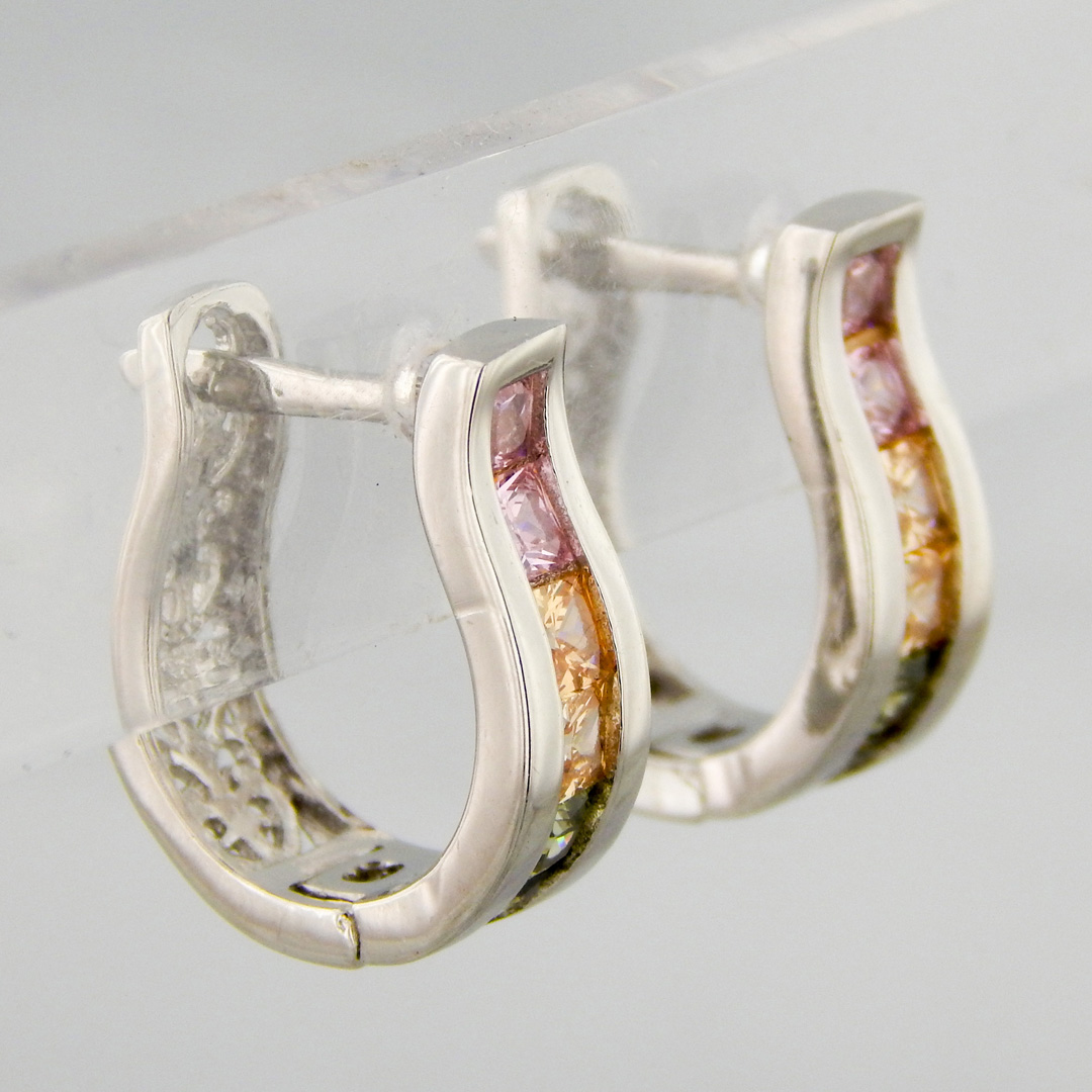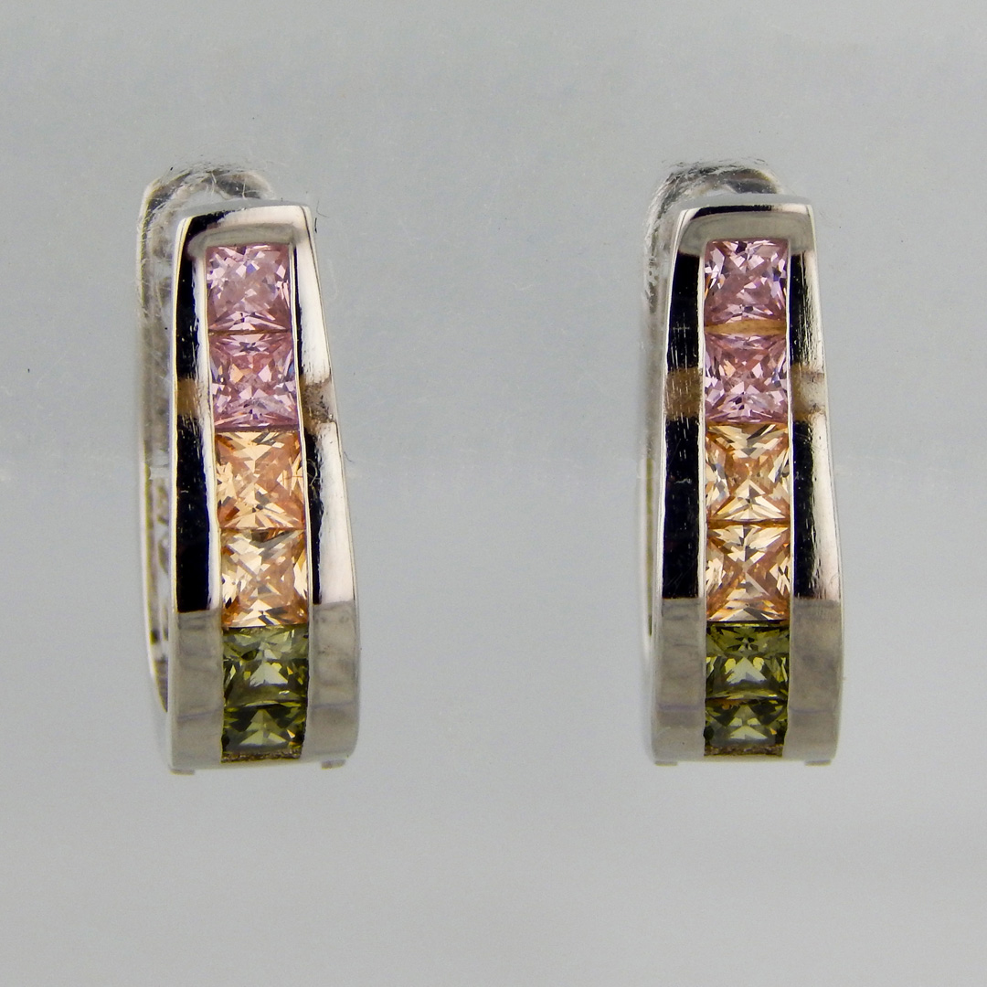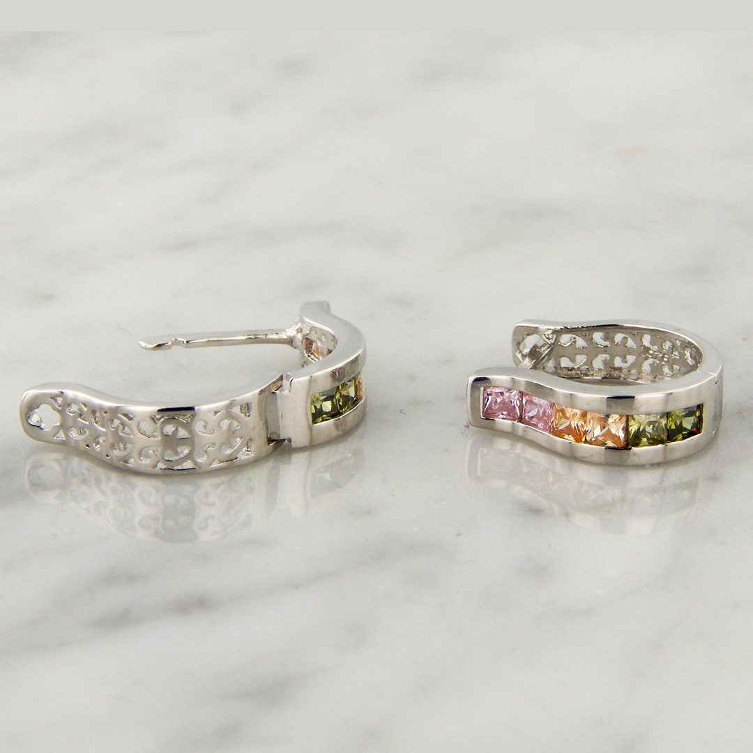 Aros de Plata Rodinada con Cubics en tonos Rosado y Amarillo del frente y calado en la Parte Posterior. De 15 mm de Alto por 13 mm de Ancho.