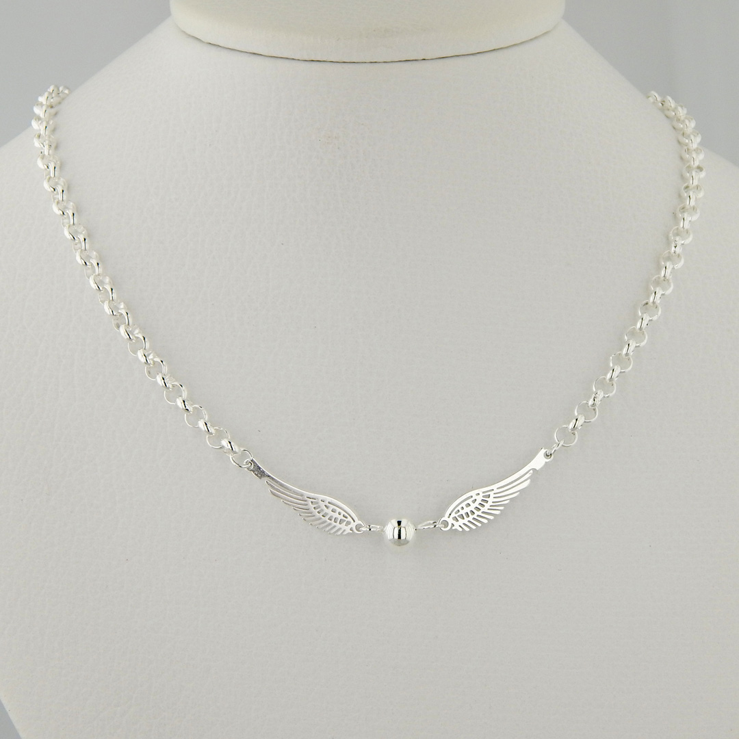 Collar de Acero Blanco con Dije de Alitas de 20 x 5 mm y Bolita central de 5 mm de Diámetro tipo Quidditch (HP) en Cadena Rolo. Largo del Collar, 45 cm mas 5 cm de extensión.