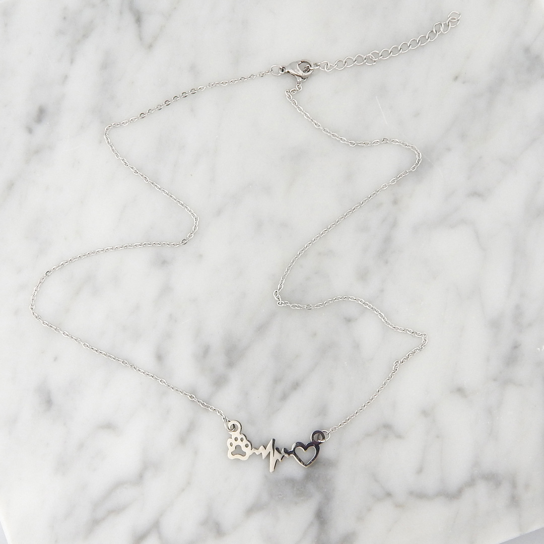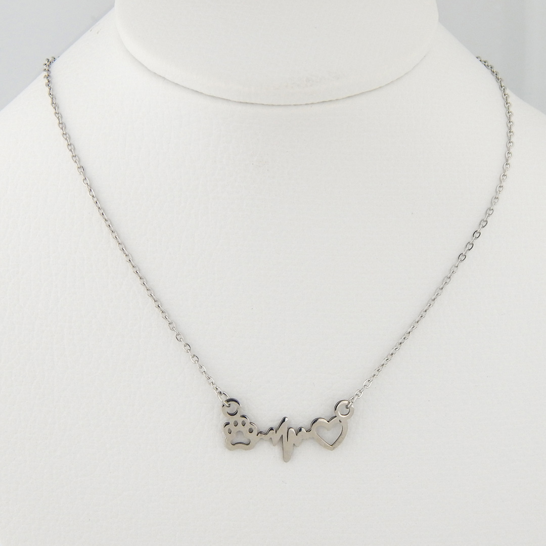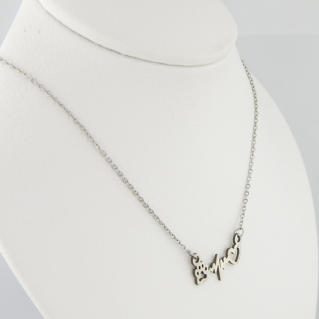 Collar de Acero con Dije de Corazón, Latido y Huella de 26 x 10 mm aproximadamente. Largo del collar, 46 cm + 5 cm de extensión.