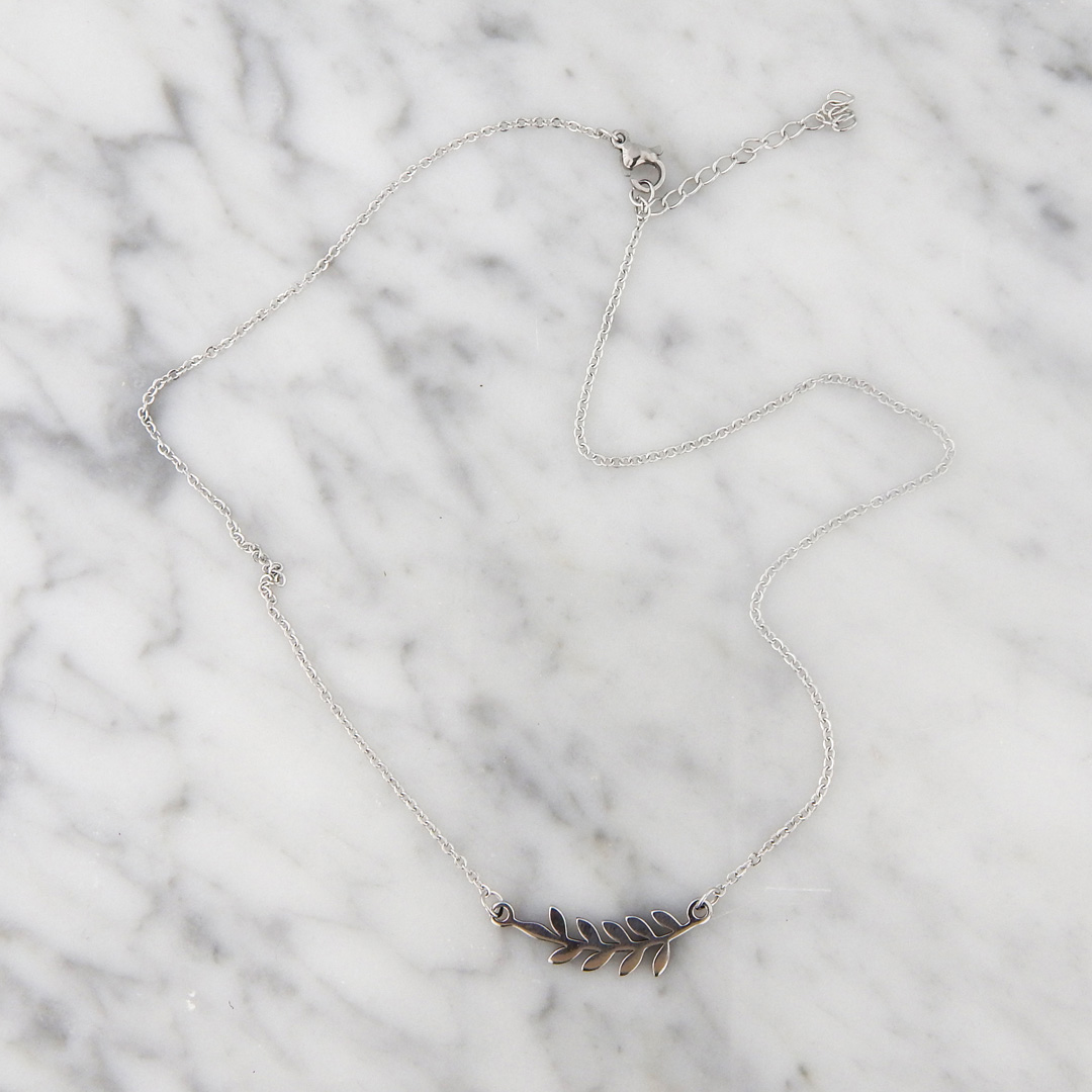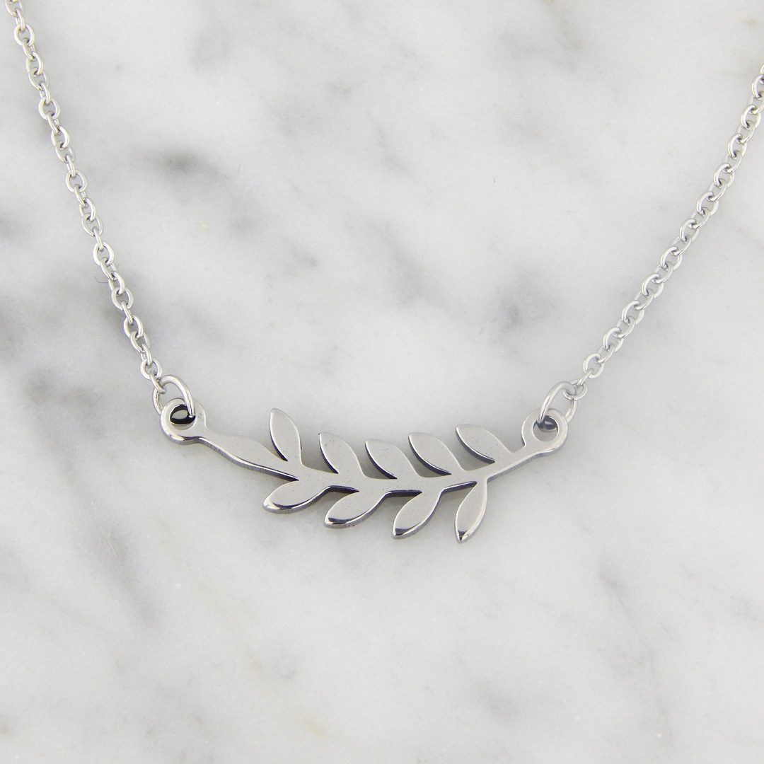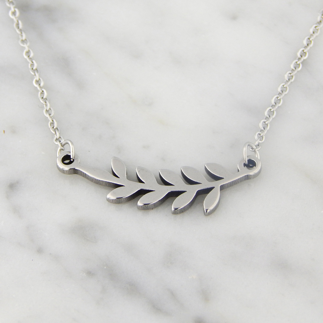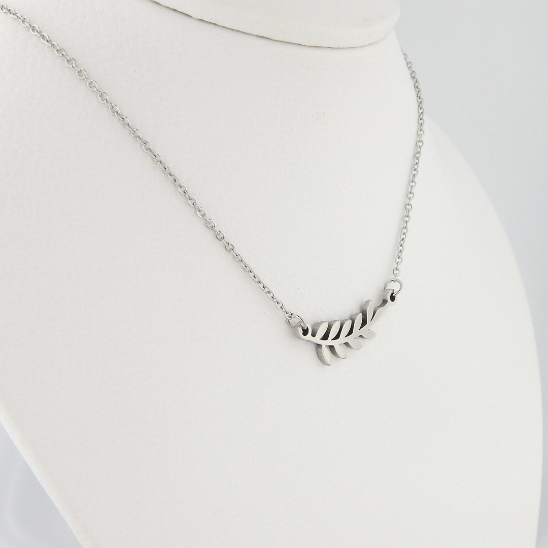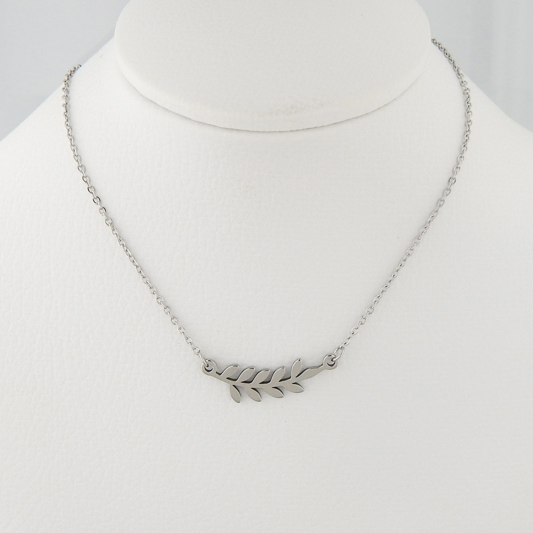 Collar de Acero con Dije en Forma de Rama de Laurel de 25 mm de largo y 8 mm de ancho aproximadamente. Largo del collar 40 cm más 5 cm de extensión.
