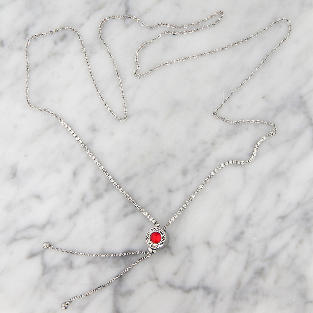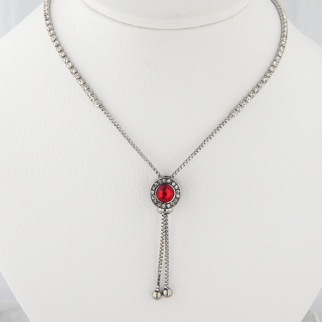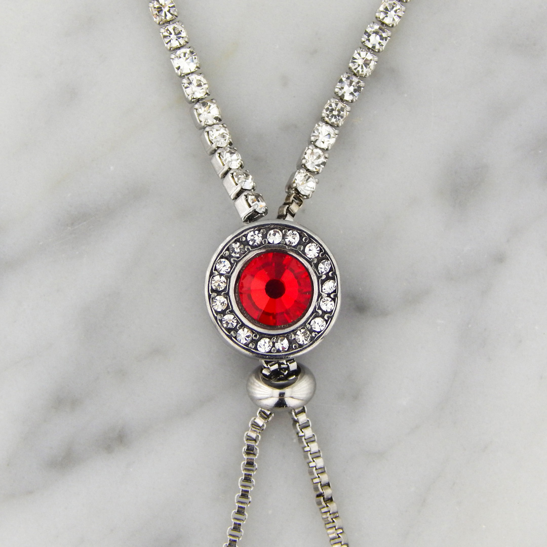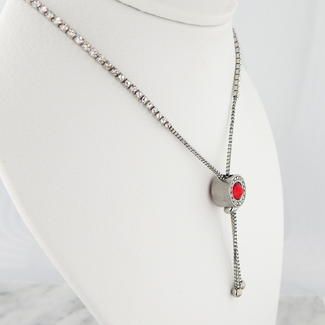 Collar de Acero Tipo Corbatero con Strasses Cuadrados de 2 mm de lado y Cilindro de 11 mm de Diámetro x 8 mm de Ancho con contorno de Strasses de 1 mm y 1 Strass Rojo Central de 7 mm de Diámetro. Largo total de la pulsera, 90 cm. Regulable.