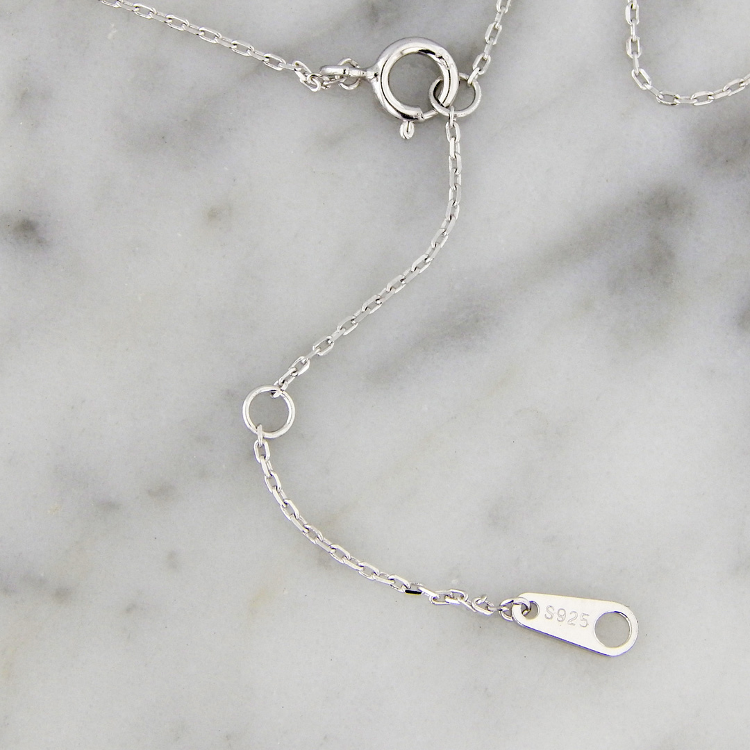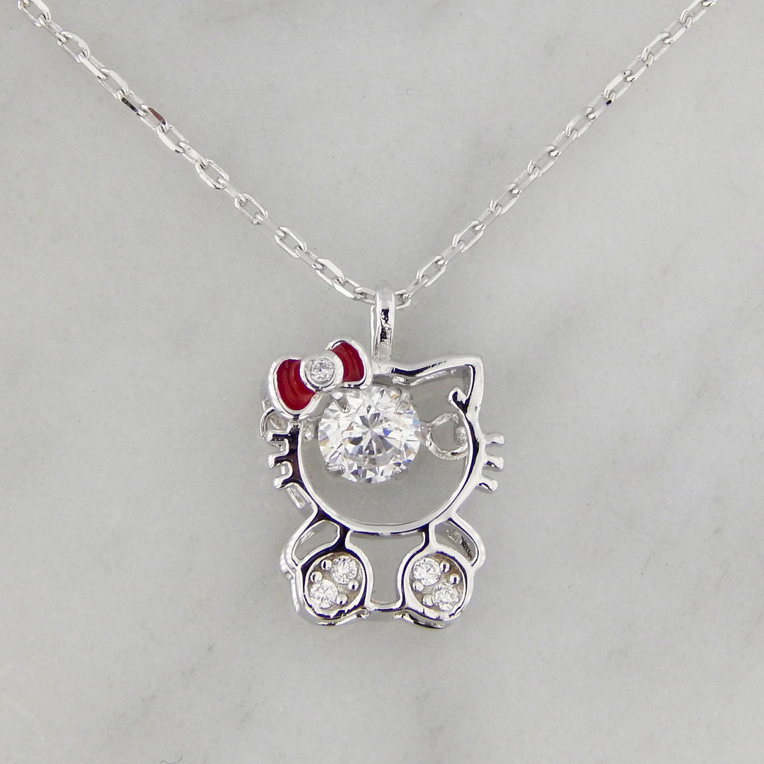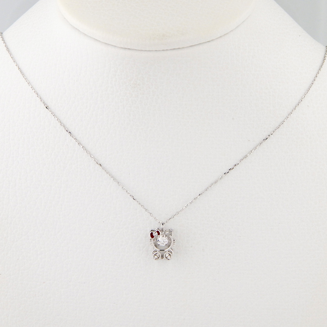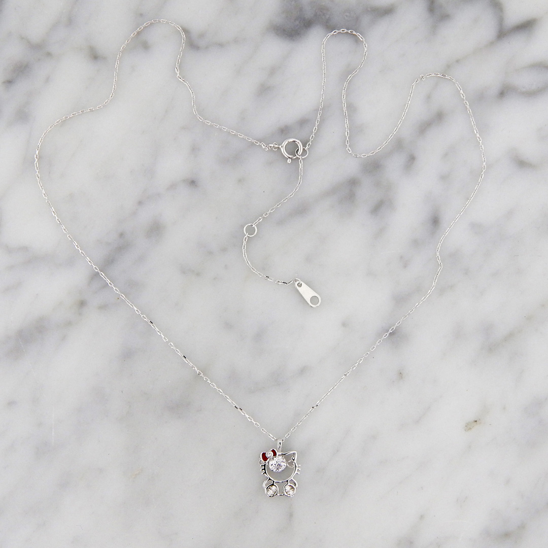 Collar de Plata Rodinada con Dije en forma de Gatita de 10 x 9 mm con Moño Rojo, Incrustaciones de Cubic en Patas y Moño y Cubic Central de 4 mm de diámetro. Largo del Collar 40 cm mas 5 cm de extensión.