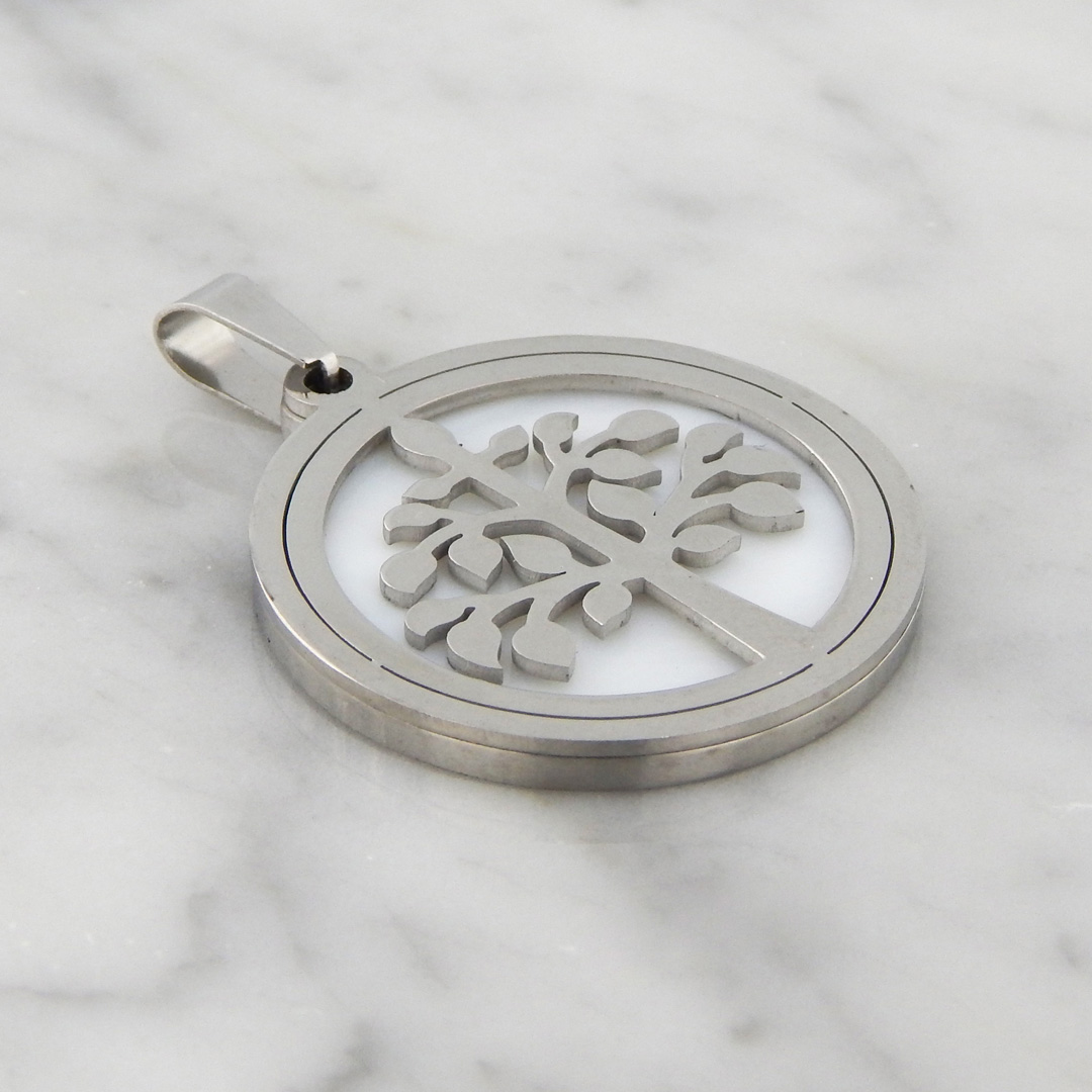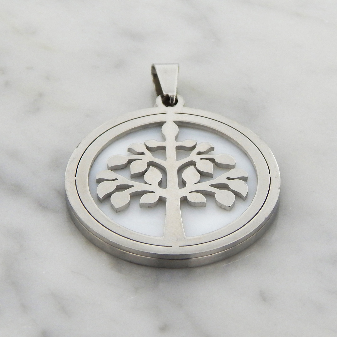 Dije de Acero con Fondo Nacarado con Motivo del Árbol de la Vida, de 28 mm de Diámetro aproximadamente.