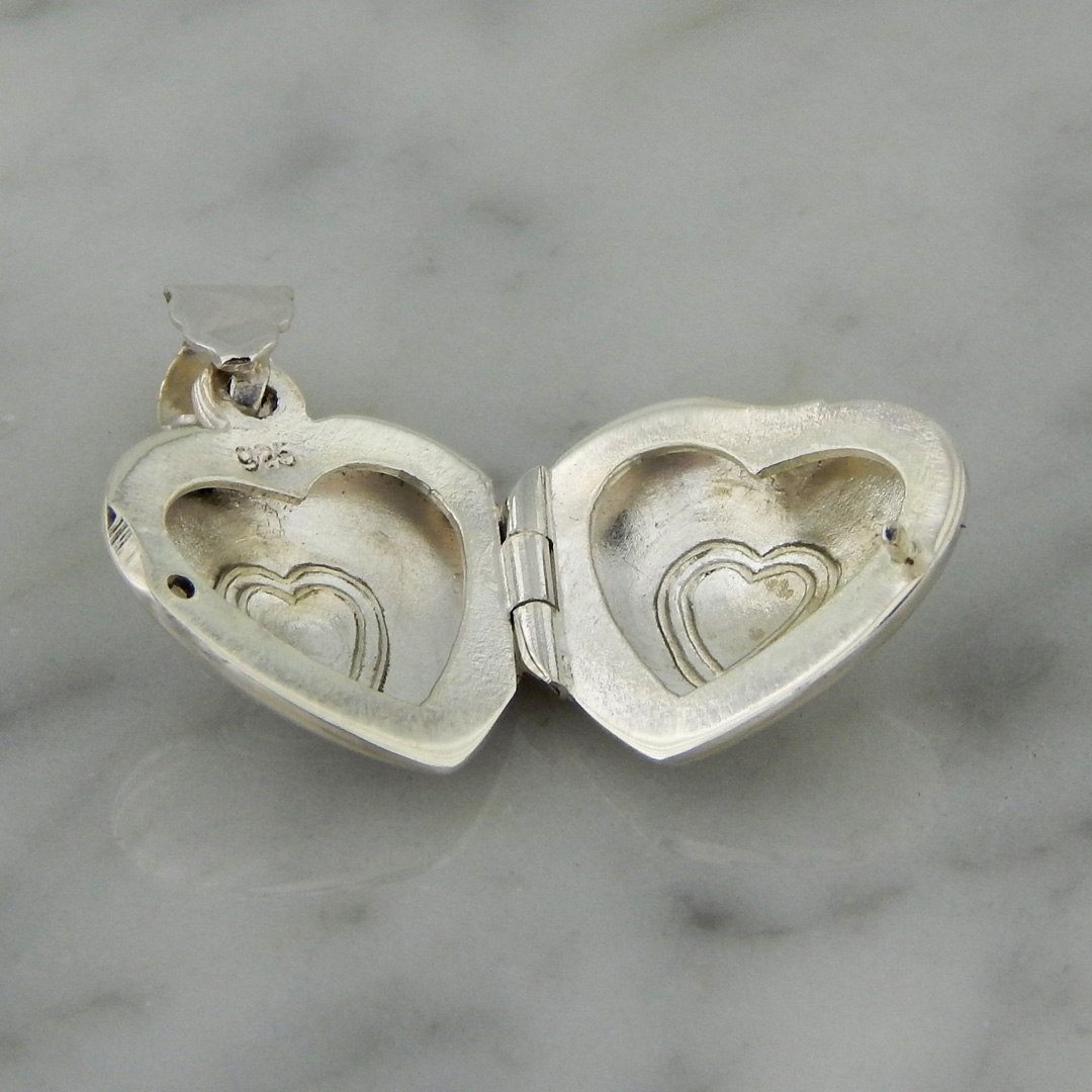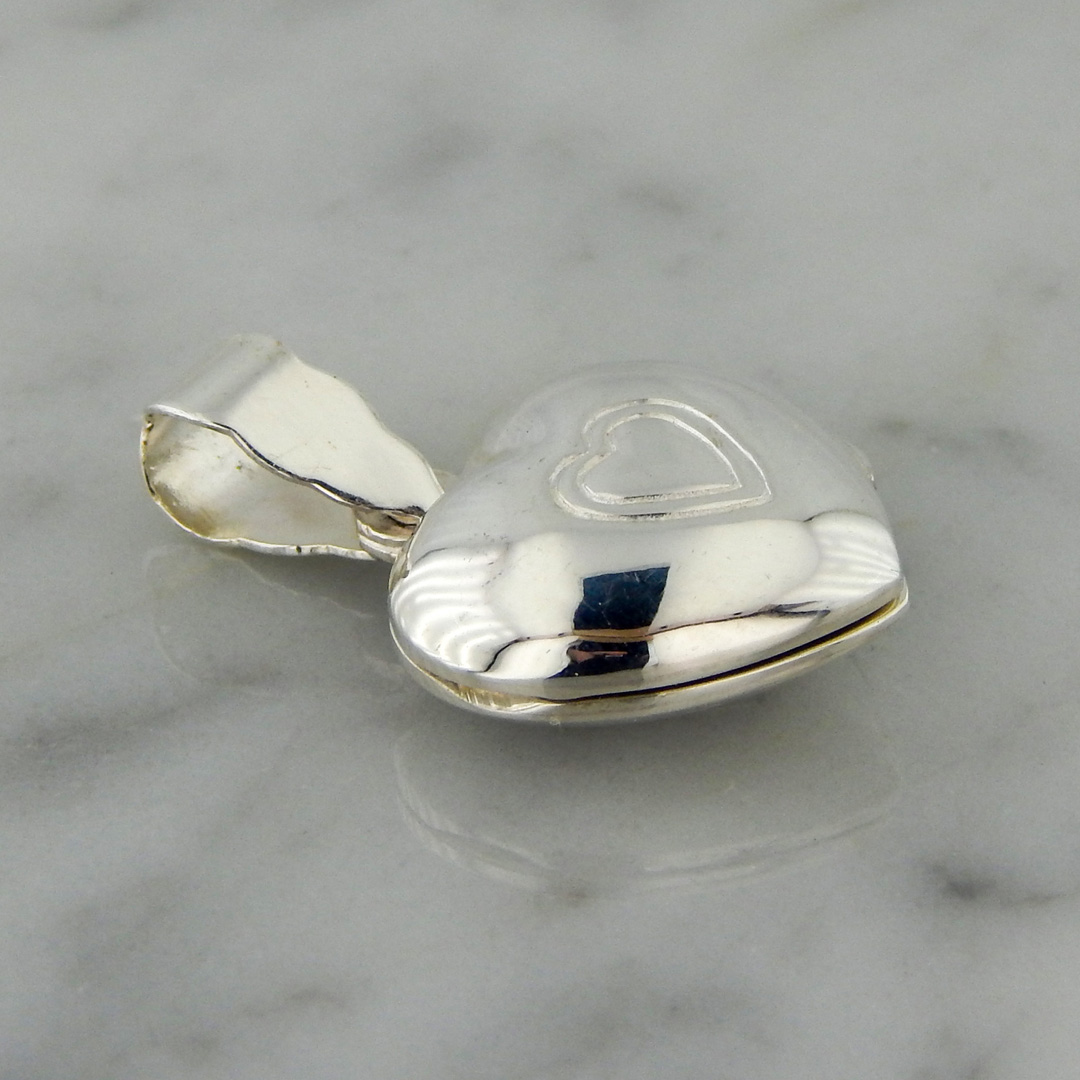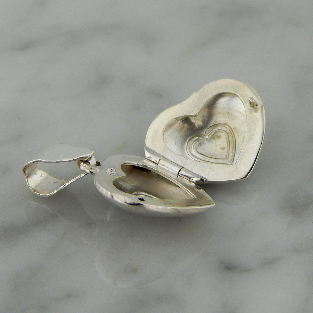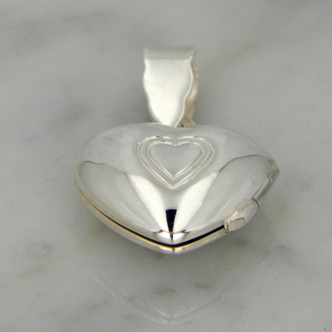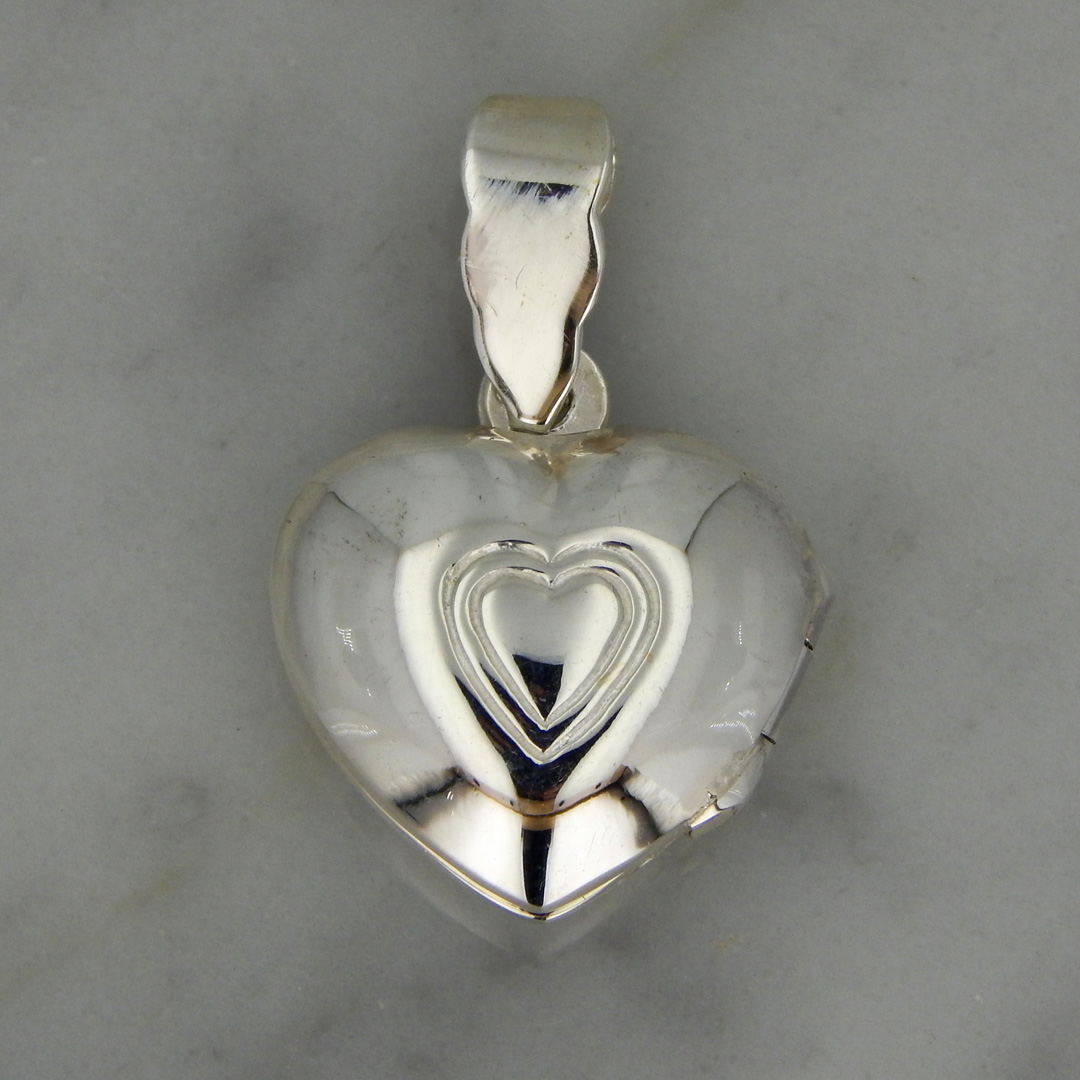 Dije Tipo Relicario de Plata en Forma Corazón de 15 x 14 mm, con Doble Corazón Grabado en el Centro.