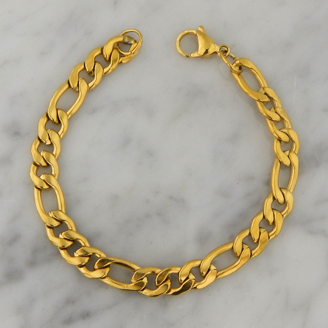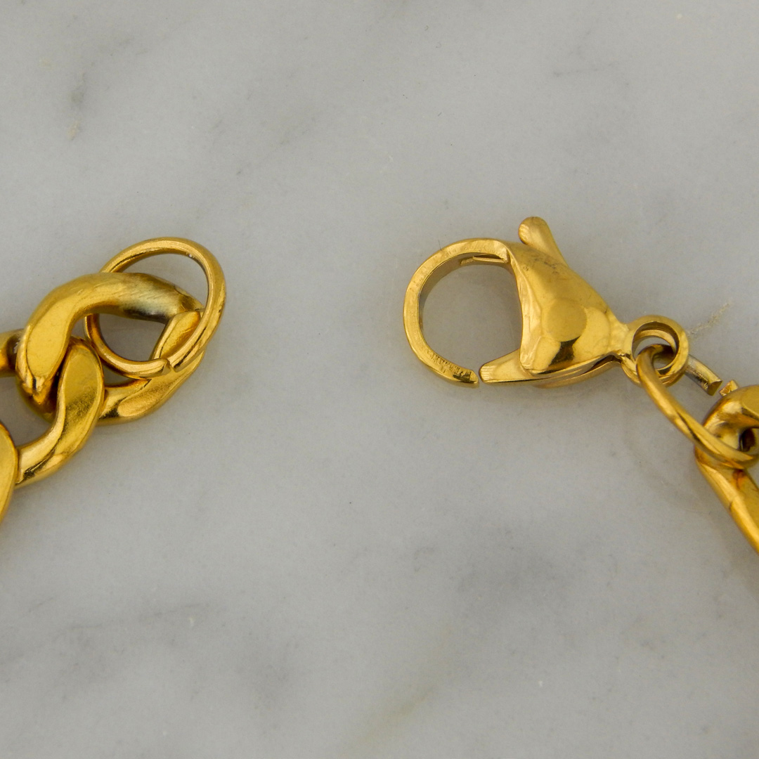 Pulsera de Acero Dorado con Cadena Groumet con 1 eslabón largo intercalado cada 3 estandar. Ancho de la pulsera, 8 mm. Largo de 20 cm.