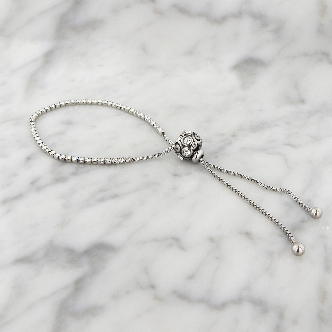 Pulsera de Acero Tipo Corbatera con Strasses Cuadrados de 2 mm de lado y Dona Labrada de 10 mm de Diámetro x 8 mm de ancho con Strasses de 3 mm de Diámetro. Largo total de la pulsera, 30 cm. Regulable.