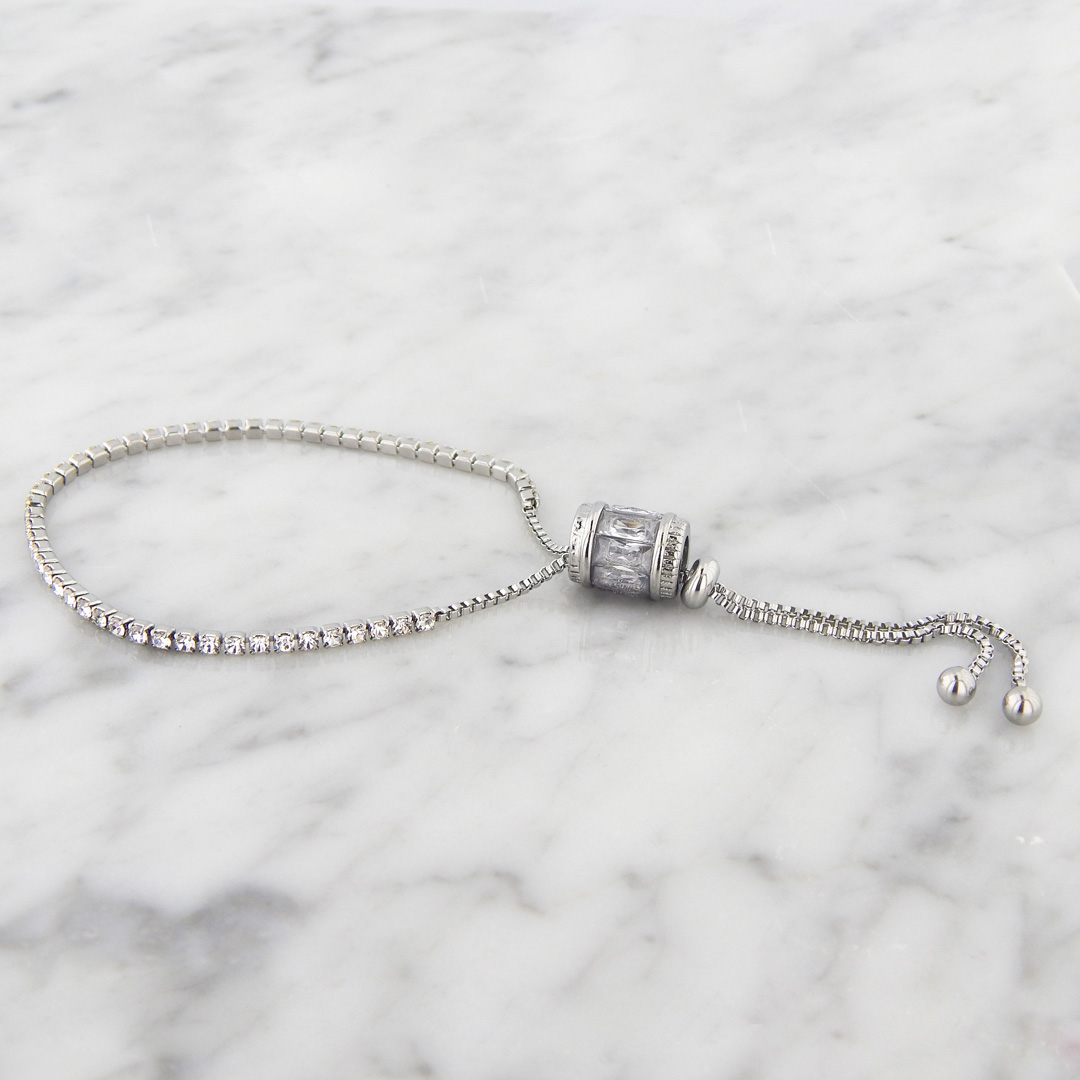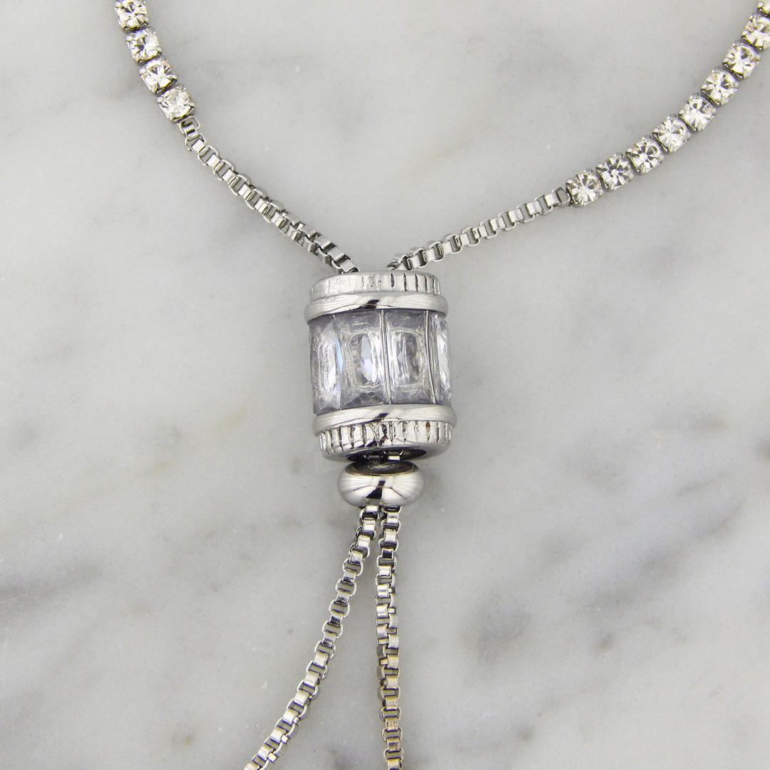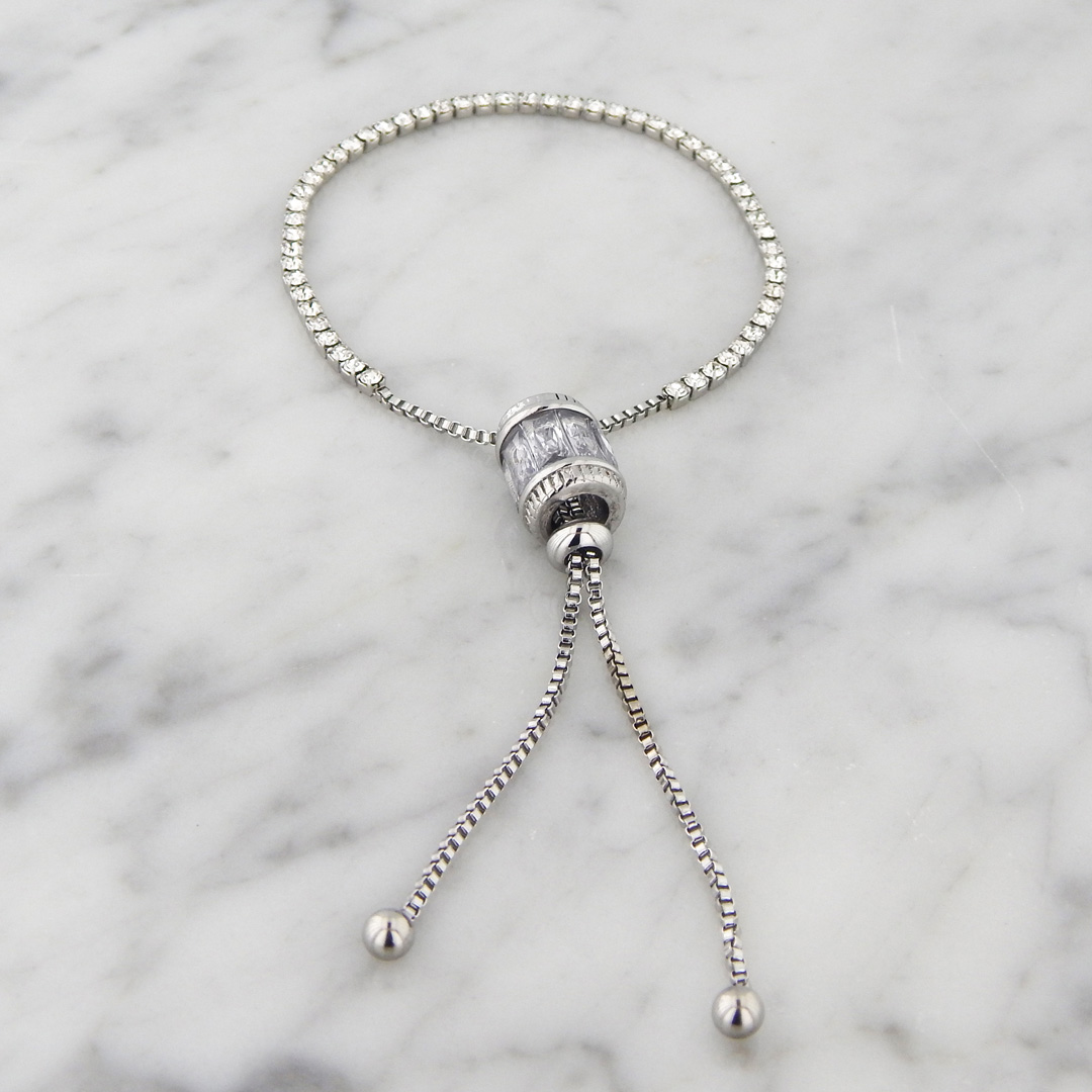 Pulsera de Acero Tipo Corbatera con Strasses Cuadrados de 2 mm de lado y Cilindro de Strass de 10 mm de Diámetro x 12 mm de alto. Largo total de la pulsera, 30 cm. Regulable.