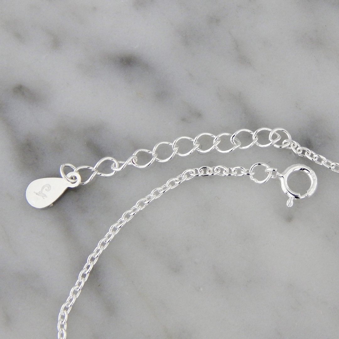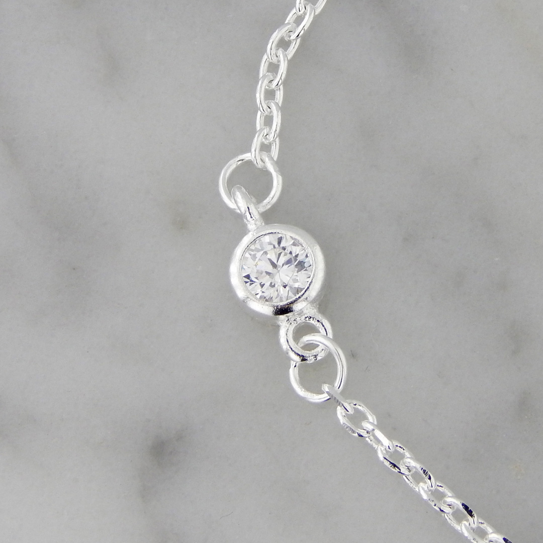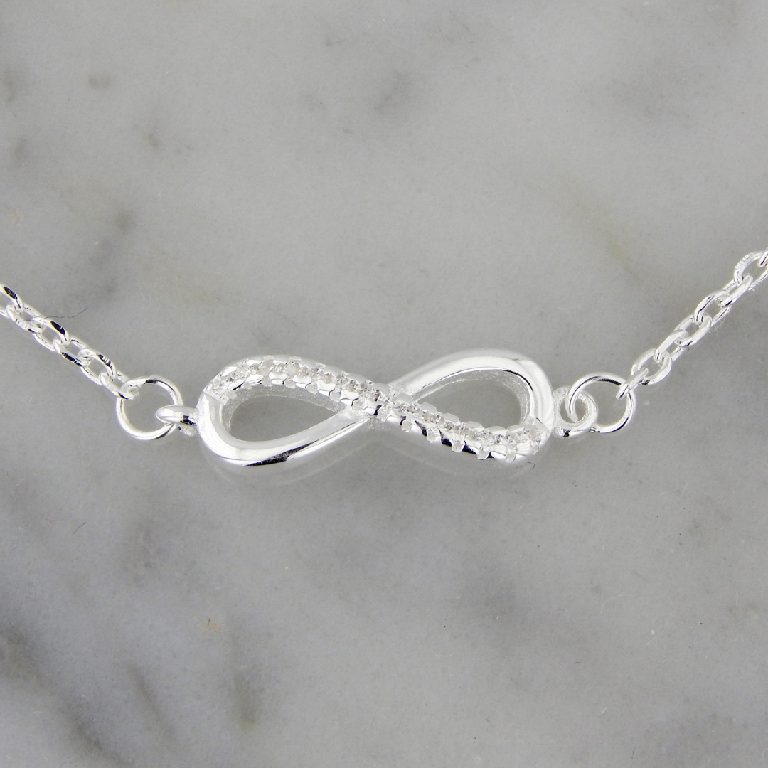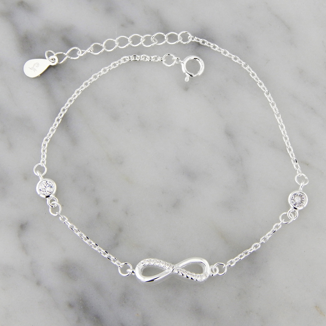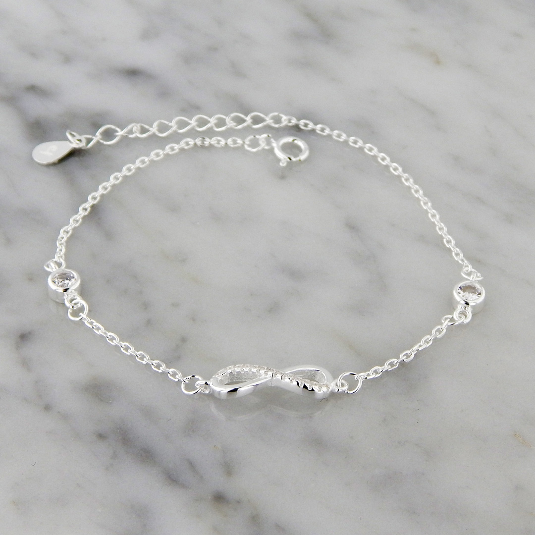 Pulsera de Plata con dije en forma de Infinito de 5 x 15 mm con Incrustaciones de Cubics Micropavé y 2 cubics de 4 mm de Diámetro. Largo de la pulsera, 17 cm mas 3 cm de extensión.
