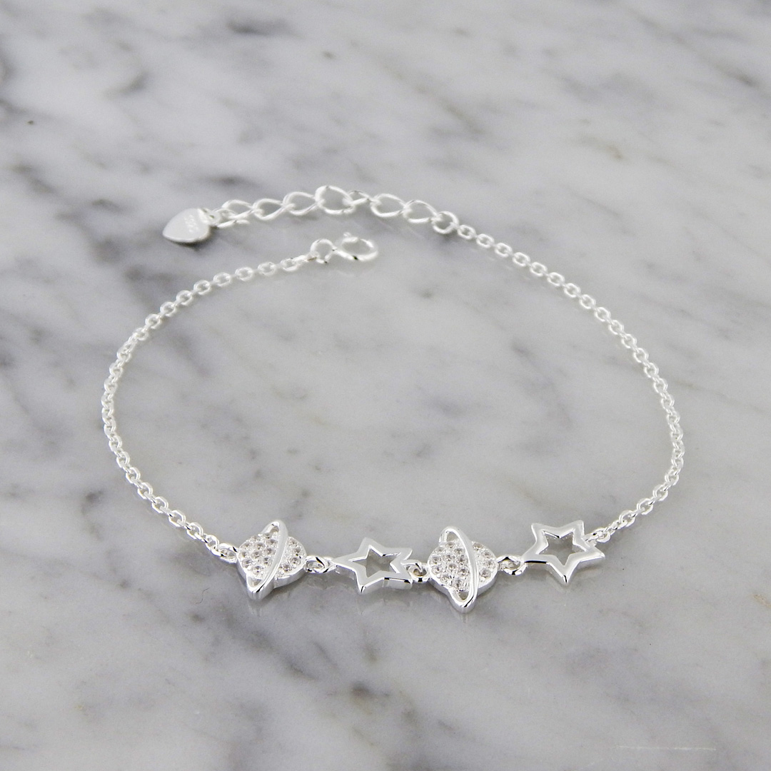 Pulsera de Plata con 2 dijes en forma del Planeta Saturno de 6 mm de Diámetro con Incrustaciones de Cubics Micropavé y 2 Estrellas de 8 mm de Diámetro de Circunferencia. Largo de la pulsera, 17 cm mas 3 cm de extensión.