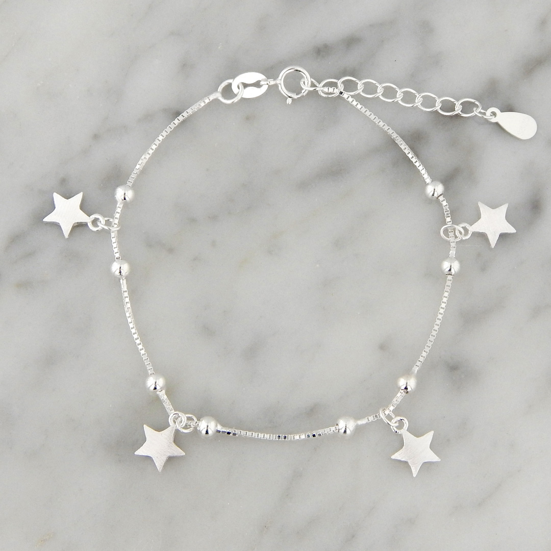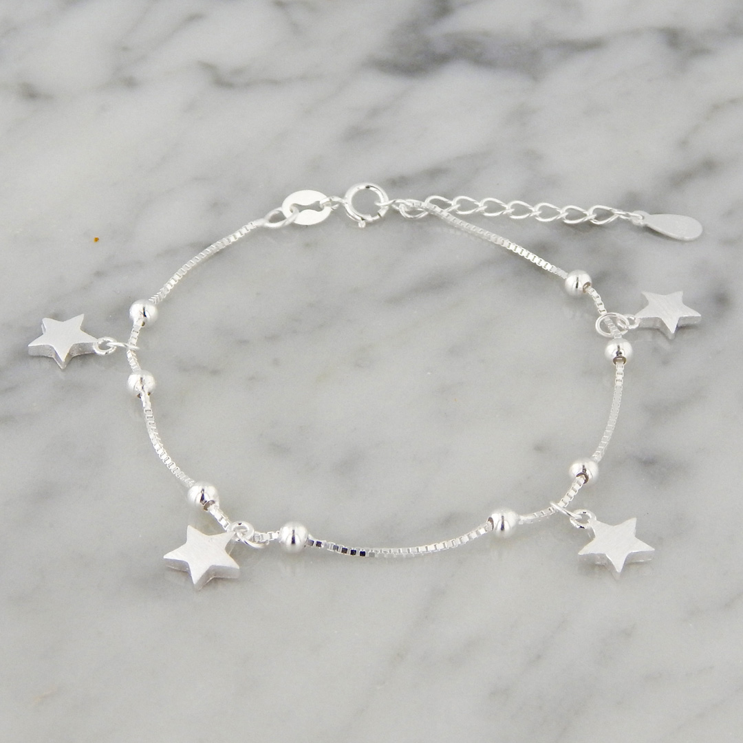 Pulsera de Plata con 4 Dijes en forma de Estrellas de 7 mm de Diámetro de Circunferencia y 8 Bolitas de 3 mm. Largo de la Pulsera 18 cm mas 3.5 cm de extensón.