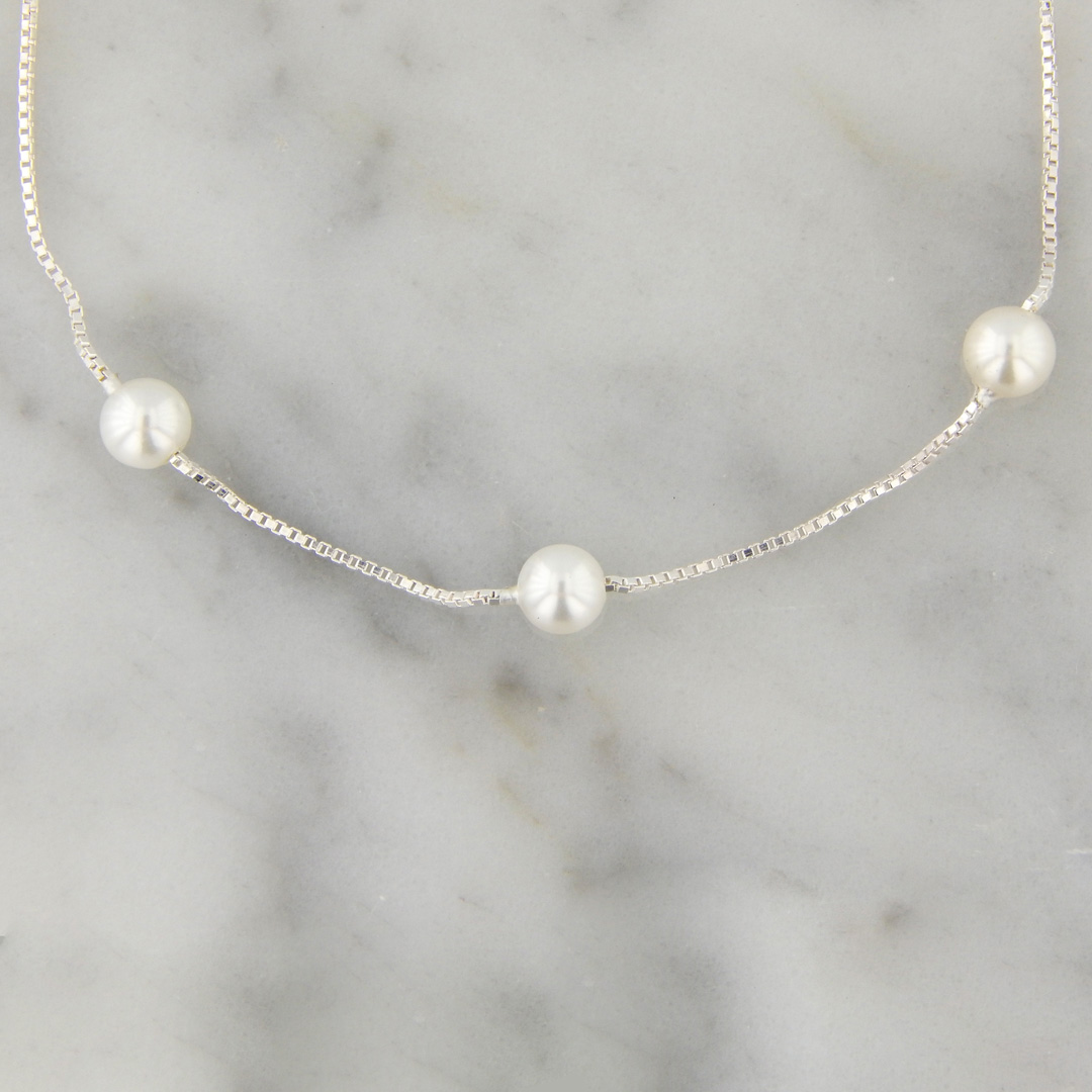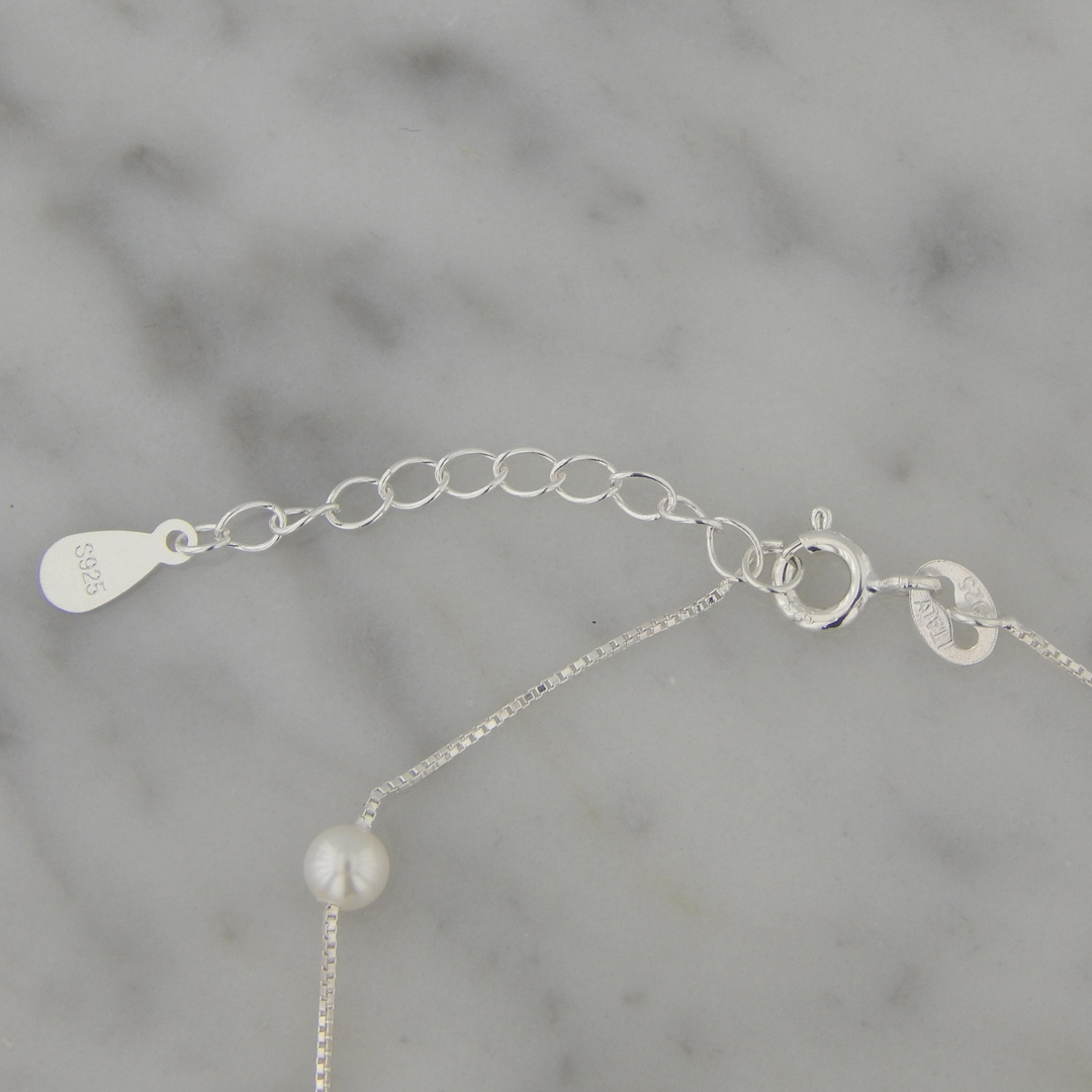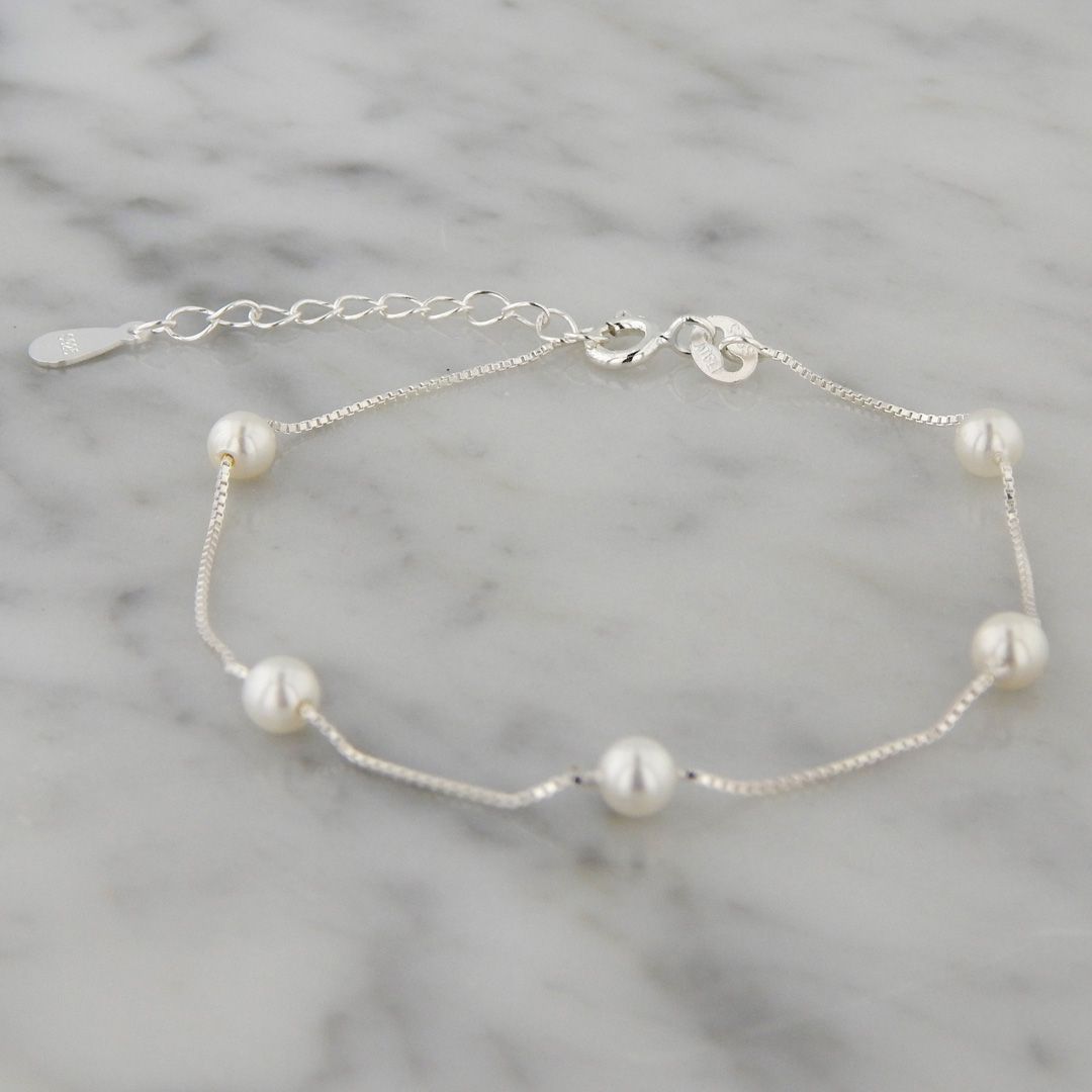 Pulsera de Plata con Cadena Veneciana de 0.7 mm de Espesor con 5 Perlas Pasantes de 4 mm de Diámetro. Largo de la pulsera, 16 cm + 3 cm de extensón.