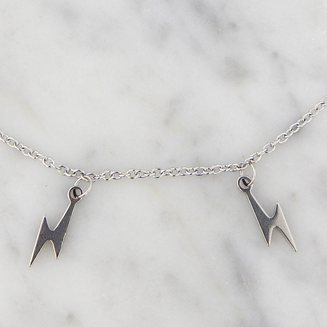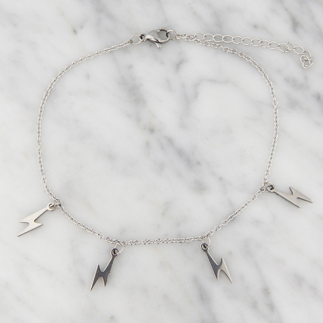 Tobillera de Acero con Dijes de Rayos de 14 mm. Largo de la tobillera 22 cm mas 5 cm de extensón.